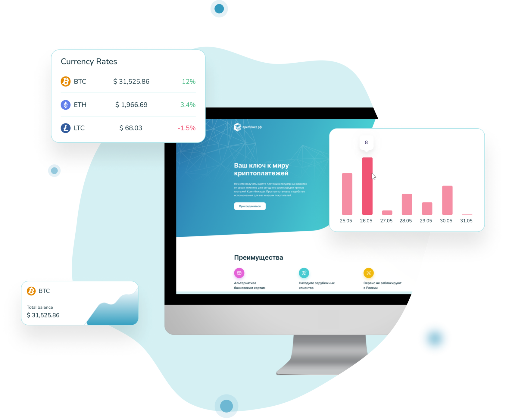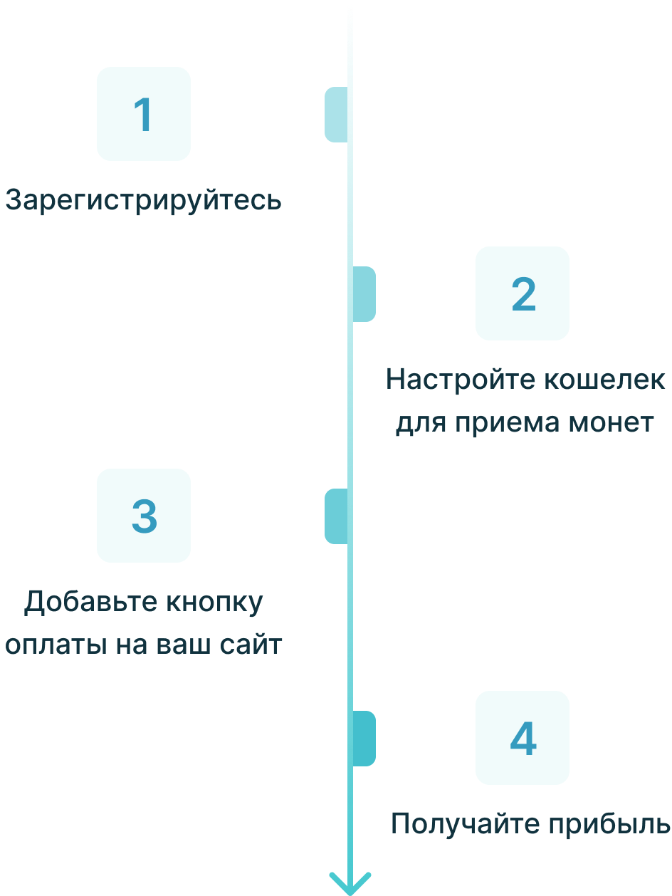 Необходимо настроить кошелек для приема криптовалют и интегрировать сервис на ваш сайт, оставив заявку.